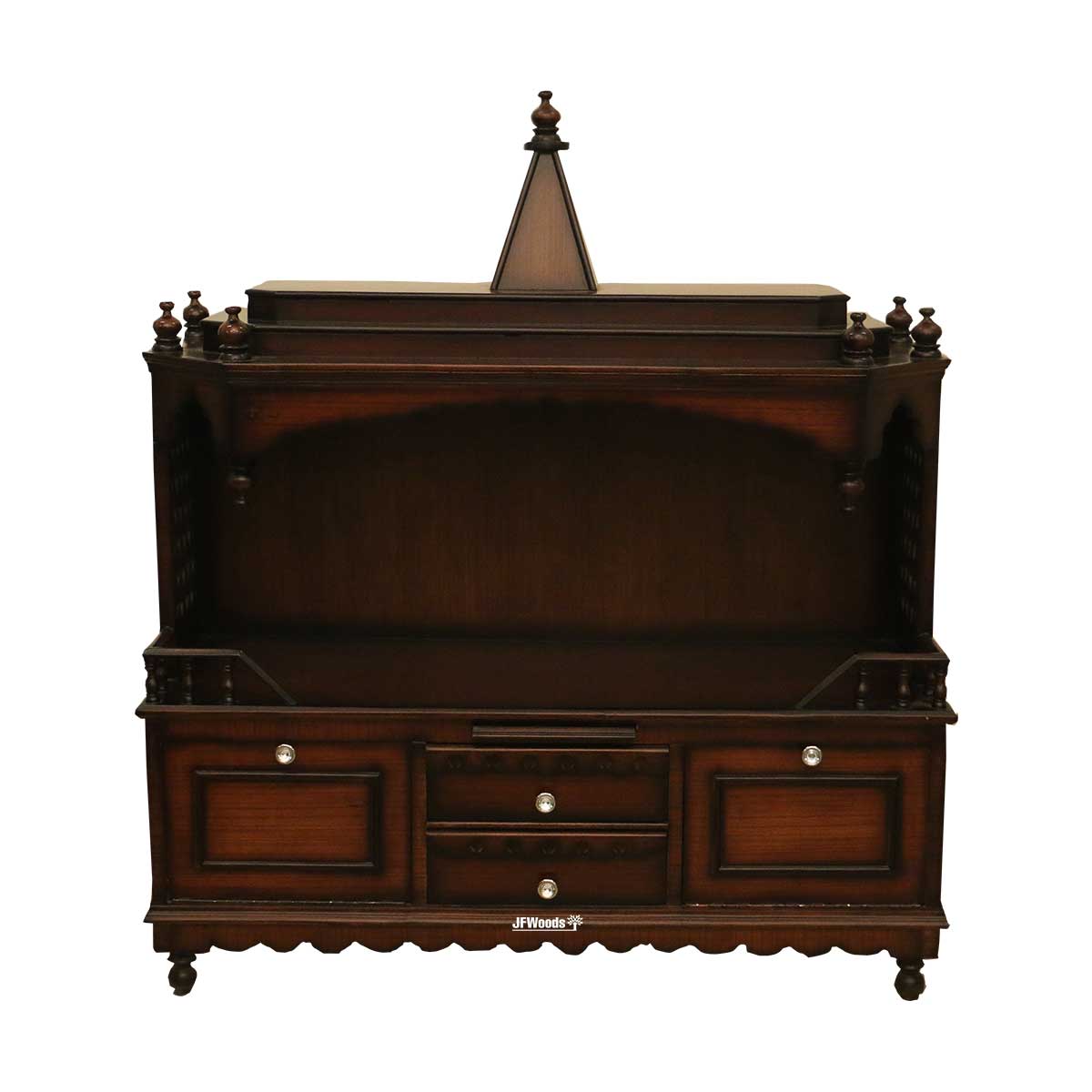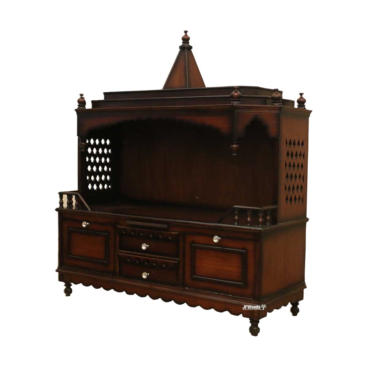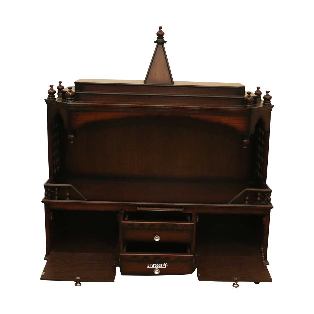 Agartha Teak Wood Mandir by jfwoods. The temple is designed and built-in teak wood and teak veneer with polish finish. The wooden temple has four drawers to store your pooja accessaries. So hereby we present home temple to bring peace and prosperity to your life for your well-being. Bring home the spirtuality with this divine fully handmade home temple. Its for the people where they can forget there differences unite to serve god and society. The wooden temple is extremely durable. It can wall mounted as well.