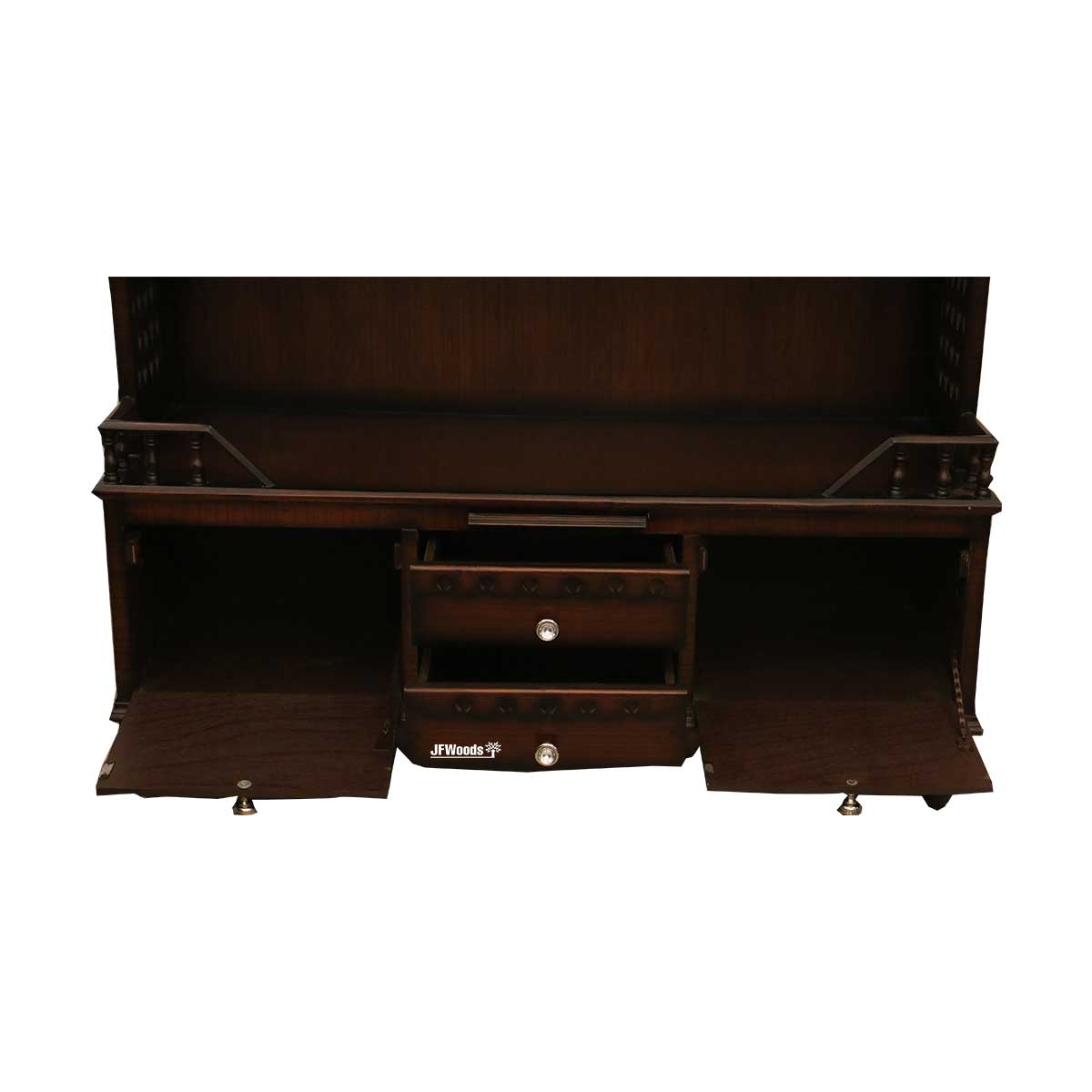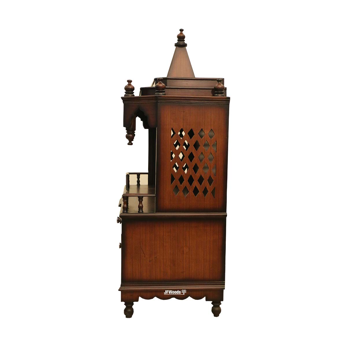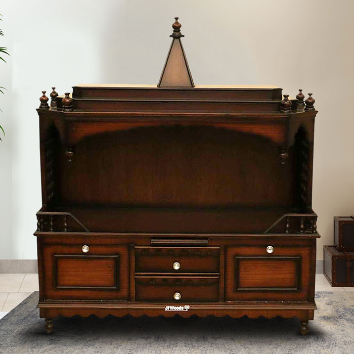 Agartha Teak Wood Mandir by jfwoods. The temple is designed and built-in teak wood and teak veneer with polish finish. The wooden temple has four drawers to store your pooja accessaries. So hereby we present home temple to bring peace and prosperity to your life for your well-being. Bring home the spirtuality with this divine fully handmade home temple. Its for the people where they can forget there differences unite to serve god and society. The wooden temple is extremely durable. It can wall mounted as well.