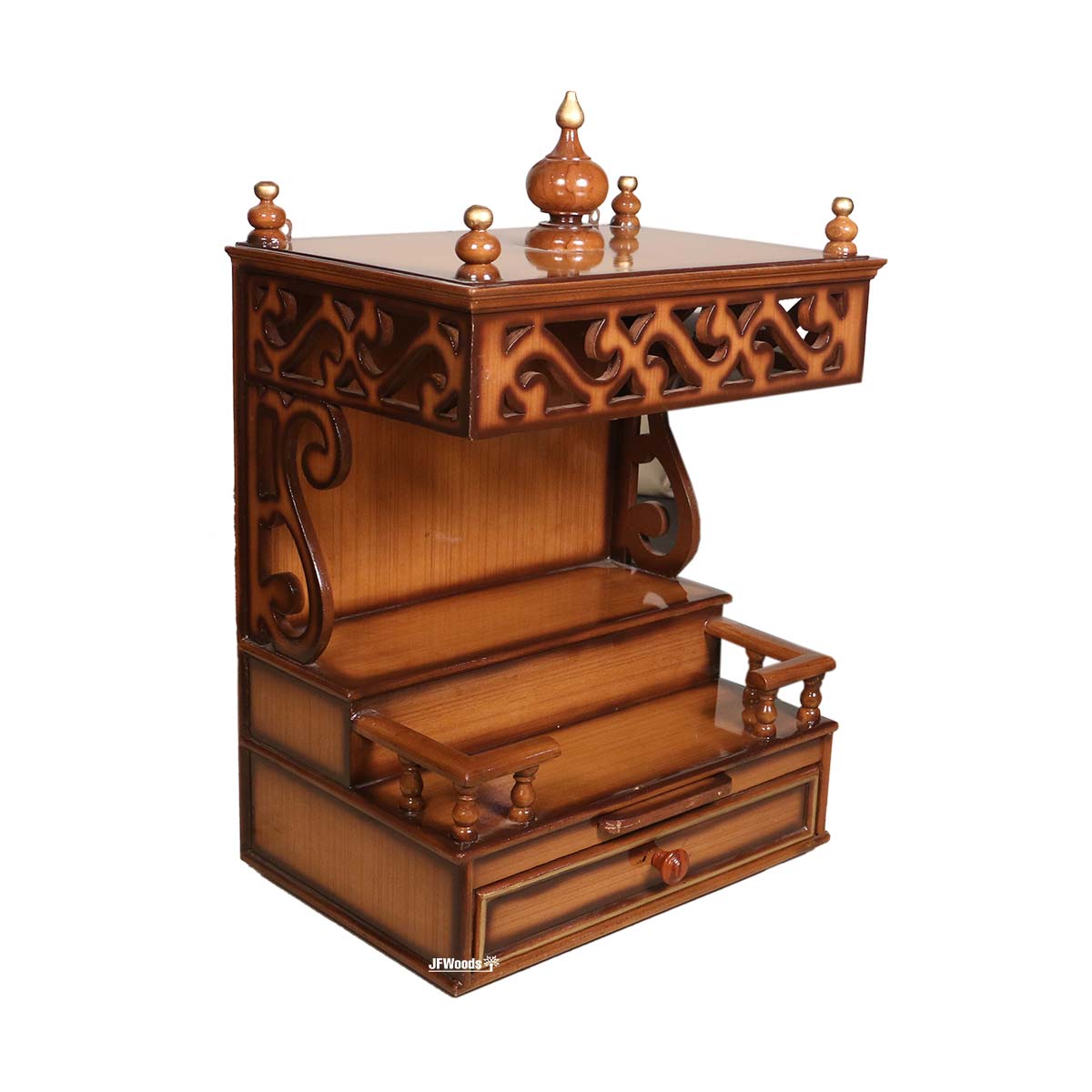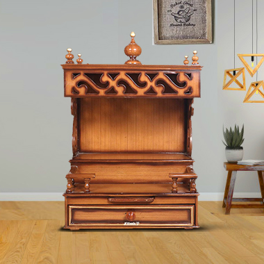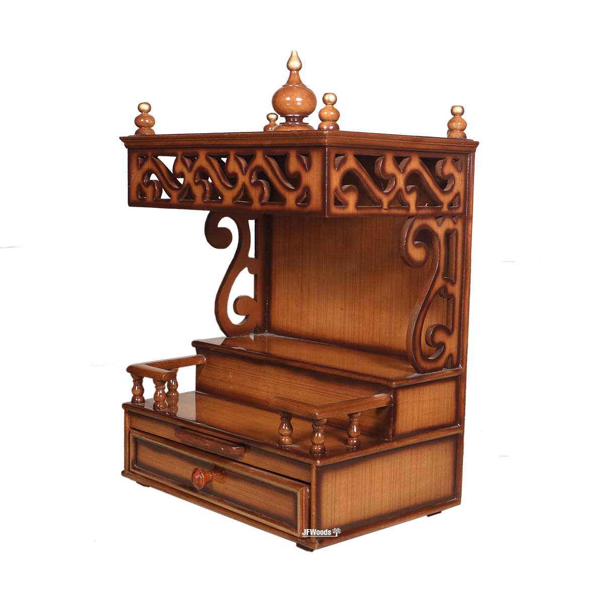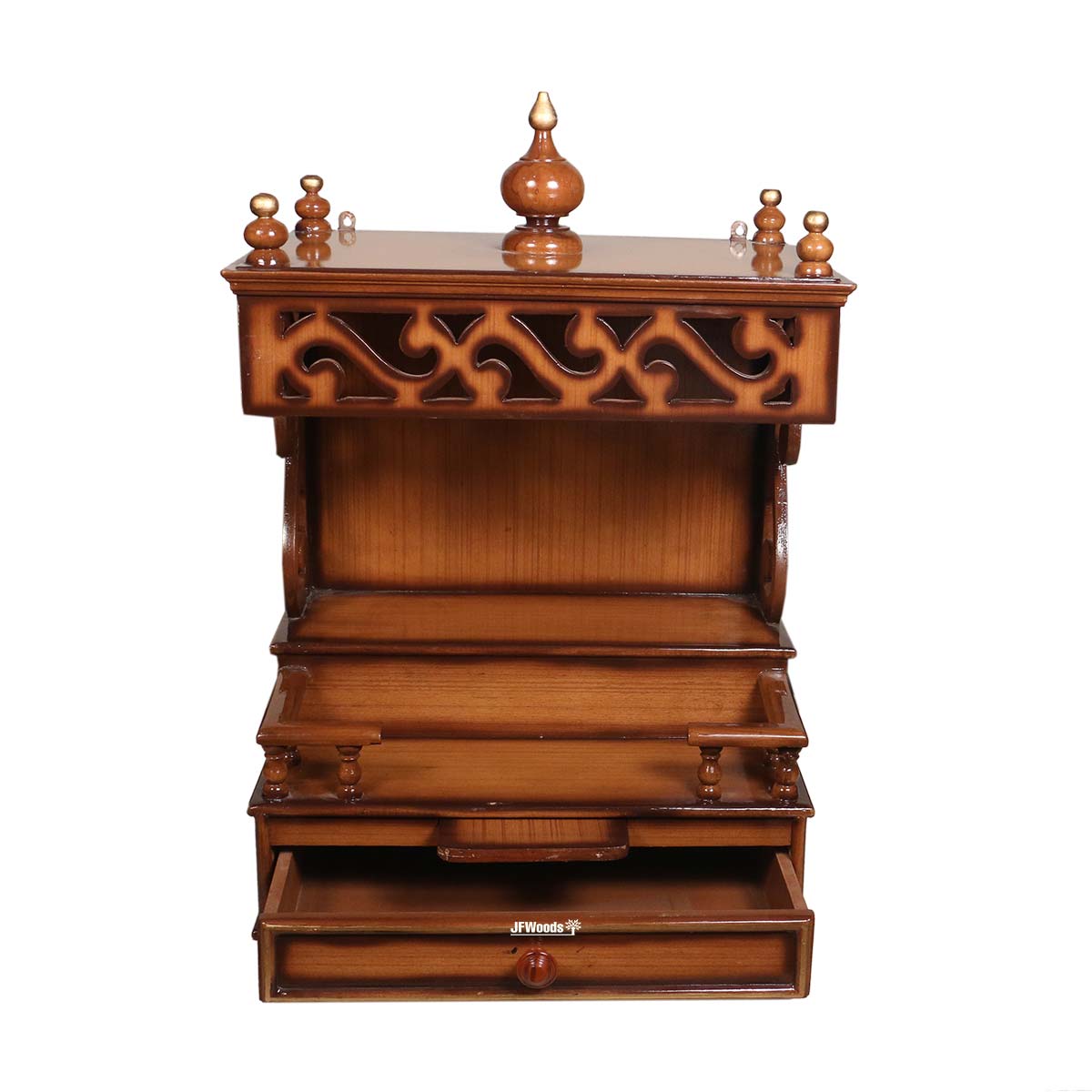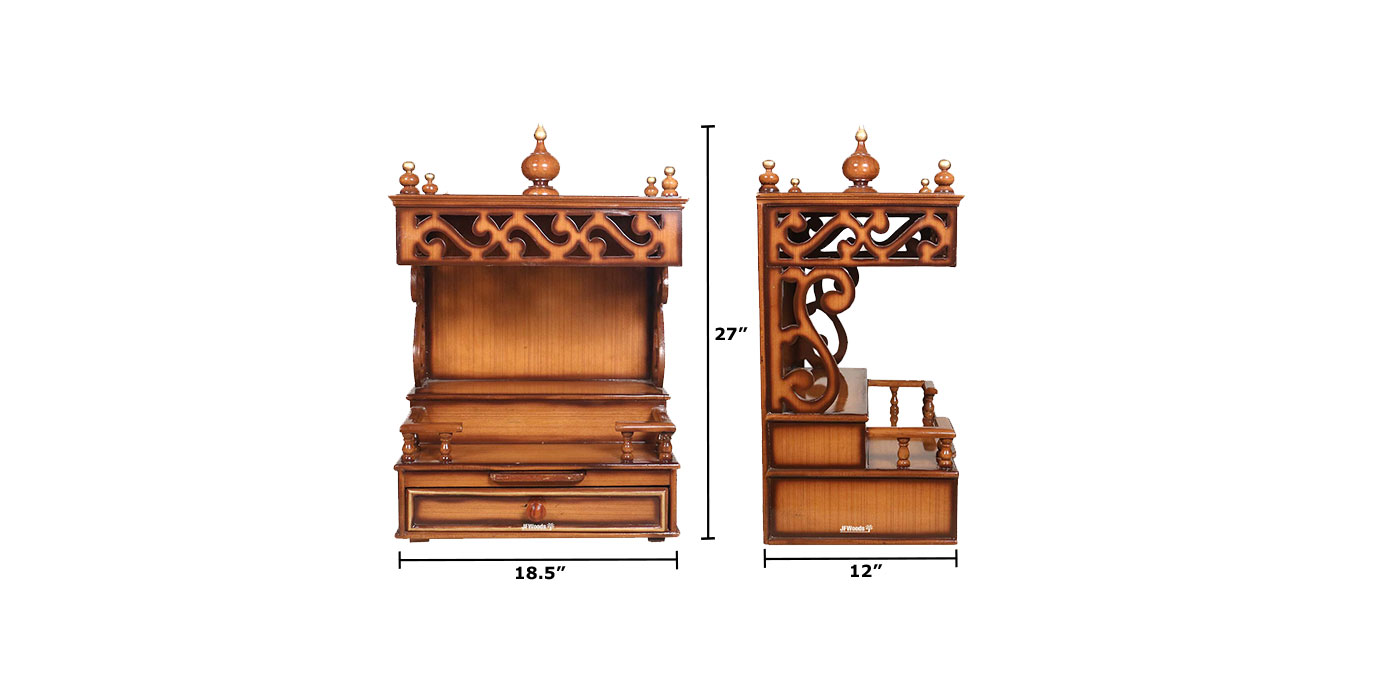 Aura Teak Wood Mandir by jfwoods. The temple is designed and built-in teak wood and teak veneer with polish finish. The wooden temple has one drawers to store your pooja accessaries. So hereby we present home temple to bring peace and prosperity to your life for your well-being. Bring home the spirtuality with this divine fully handmade home temple. Its for the people where they can forget there differences unite to serve god and society. The wooden temple is extremely durable. It can wall mounted as well.
