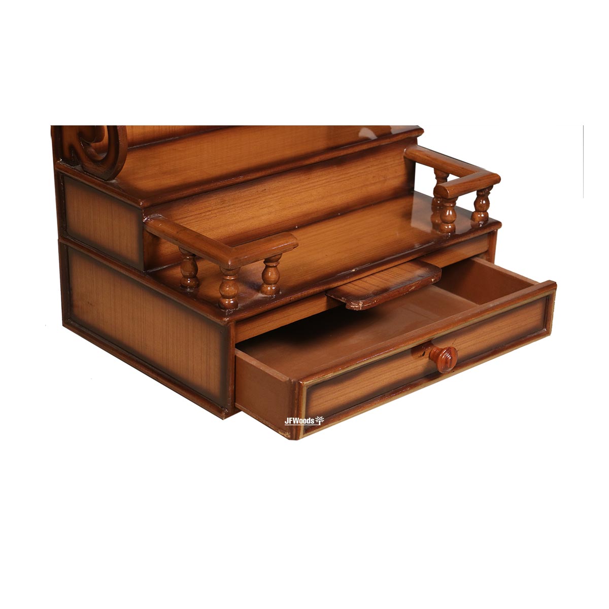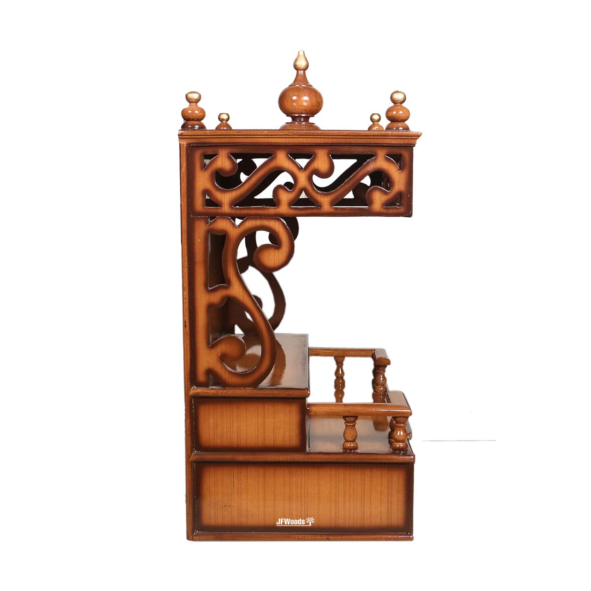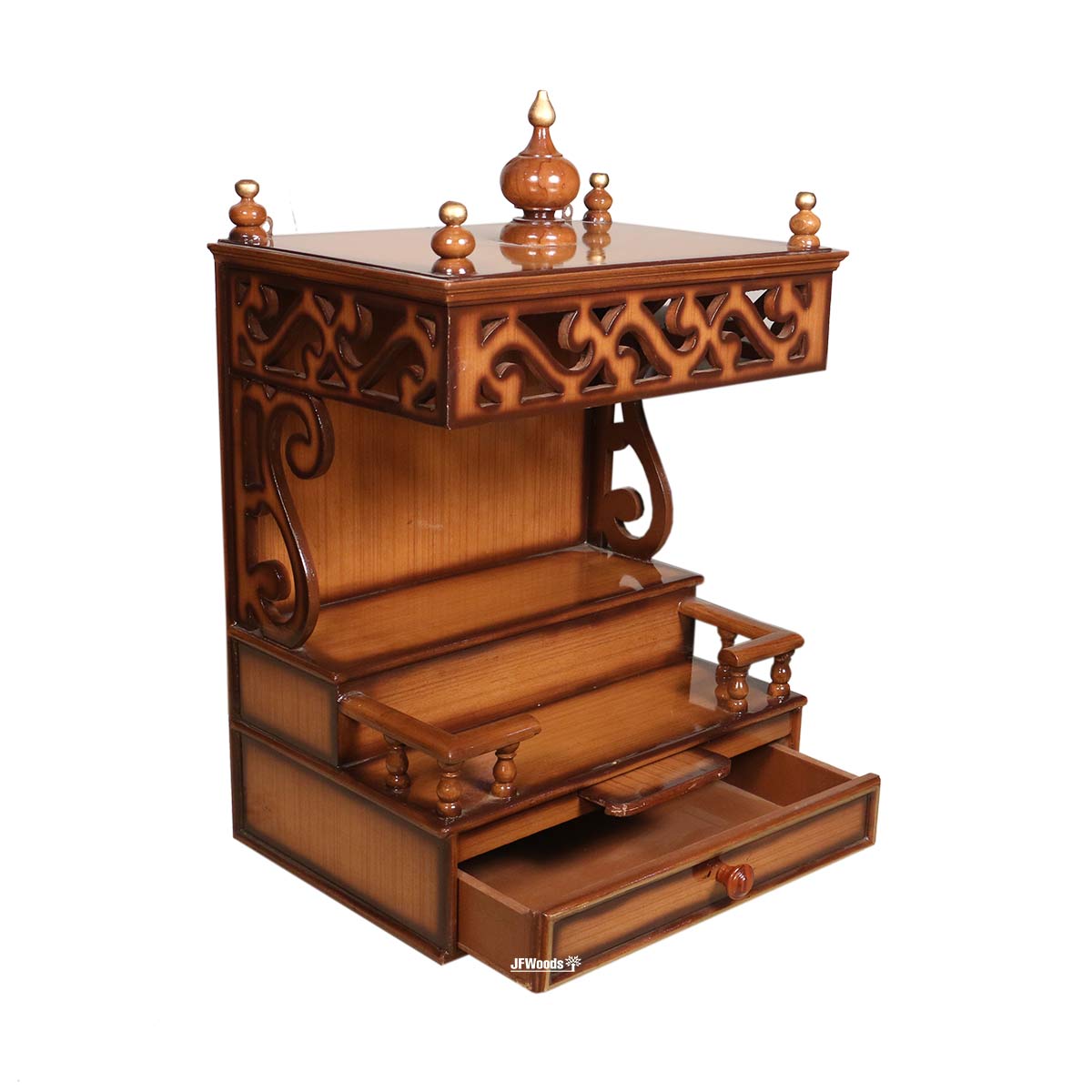Aura Teak Wood Mandir by jfwoods. The temple is designed and built-in teak wood and teak veneer with polish finish. The wooden temple has one drawers to store your pooja accessaries. So hereby we present home temple to bring peace and prosperity to your life for your well-being. Bring home the spirtuality with this divine fully handmade home temple. Its for the people where they can forget there differences unite to serve god and society. The wooden temple is extremely durable. It can wall mounted as well.
