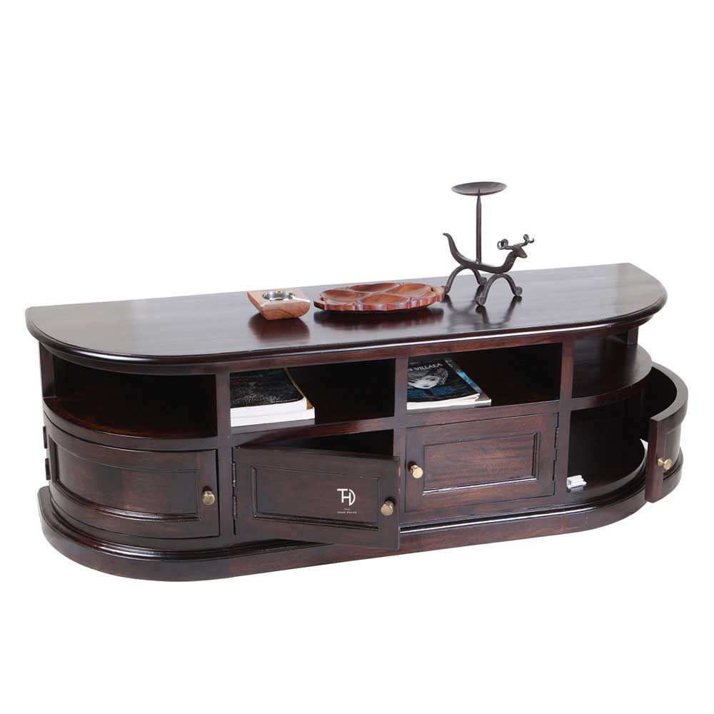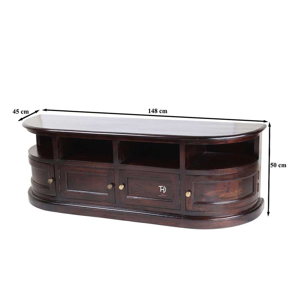 Beach TV Cabinet is handcrafted furniture with half-round shaped TV cabinet with 4 doors, made in solid mango wood & Back in MDF. A TV shelf is a combination of an open media stand with a display shelf. House your media components and other decorative items openly in these living room essentials. It can be handled easily in your living space.