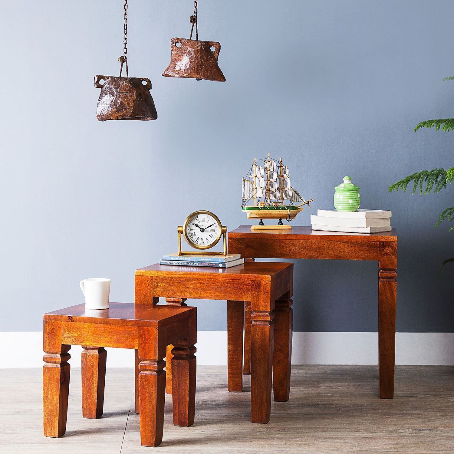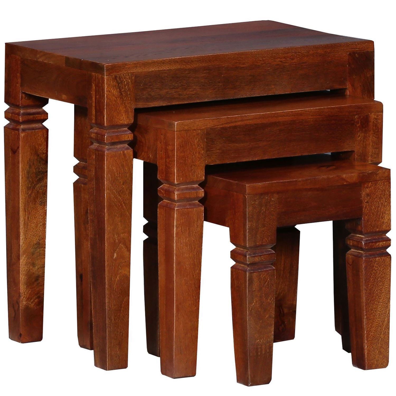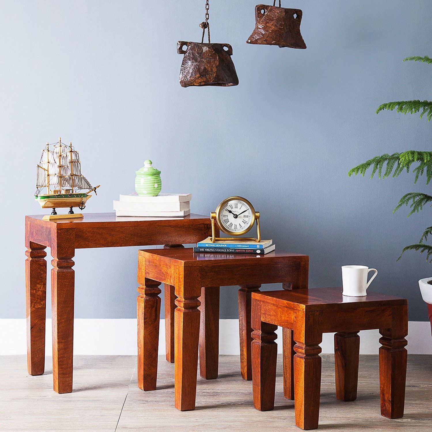 Hoaken  Solid Wood  Table Set of 3 pcs by JfWoods is a multi-utility item, Made in solid Sheesham wood set of 3 pcs with different sizes which fits one under one. Natural finish gives a very attractive look with natural grain visibility. Texture and color may vary from pieces to Pieces due to natural material. It is easy to use and handle and has a long life.