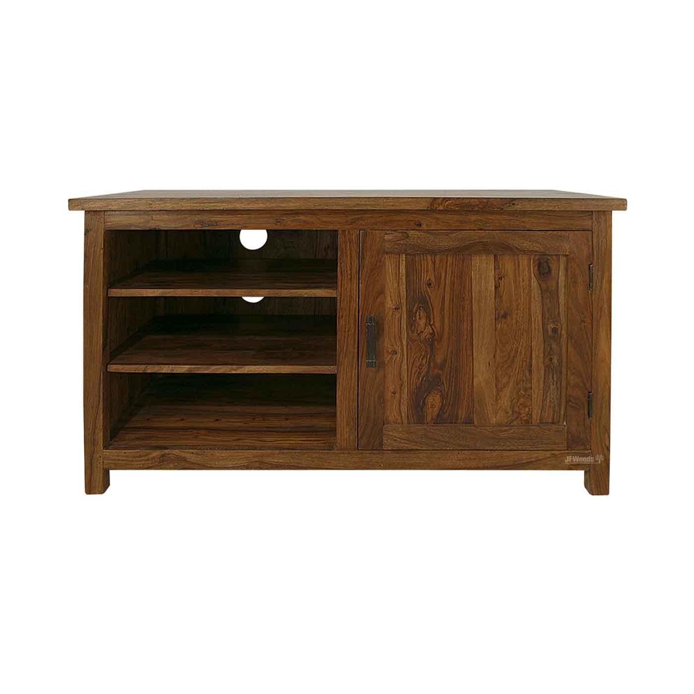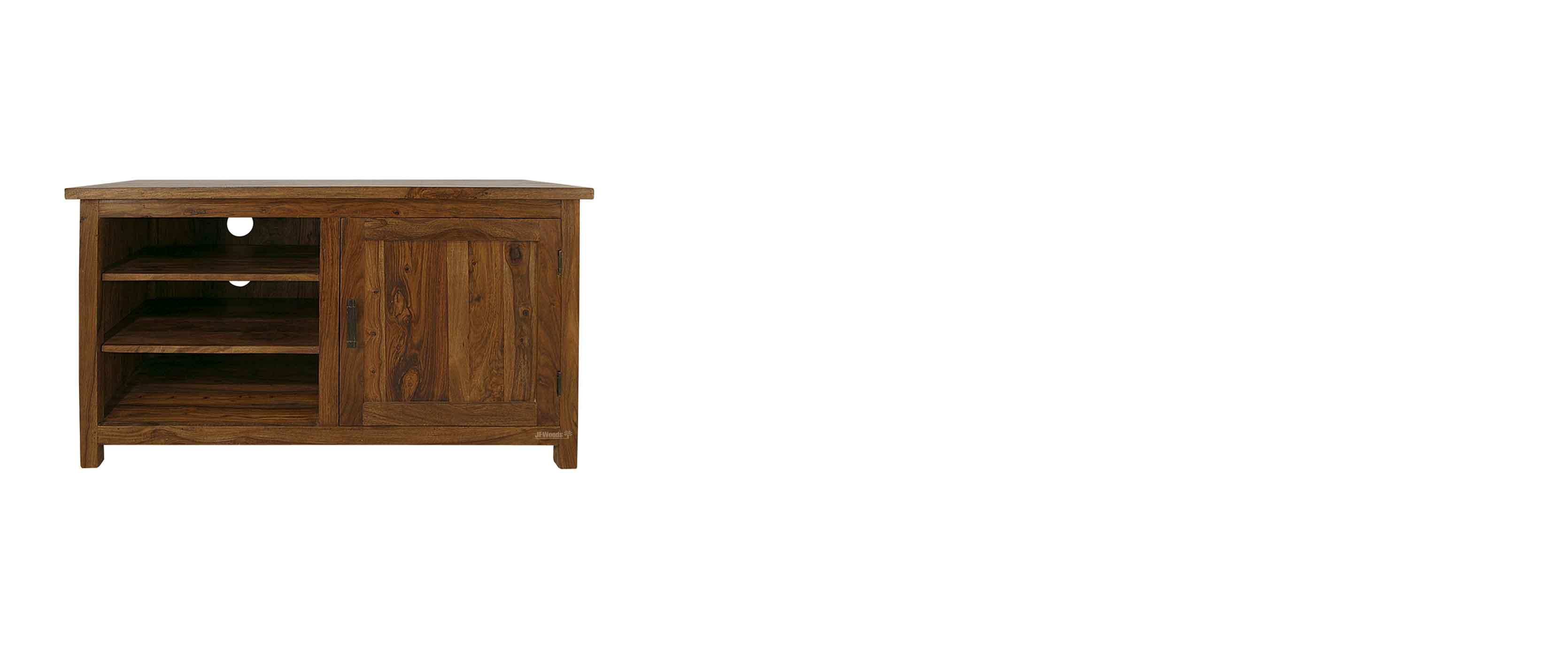 TV cabinet with 1 door & 3 open shelf made in solid sheesham wood .TV shelf is a combination of an stand with a display shelf. components and other decorative items openly in these living room & Drawing room essentials. It can be handled easily in your living room & Drawing room space.