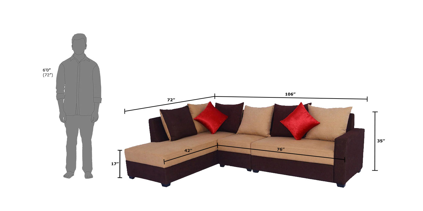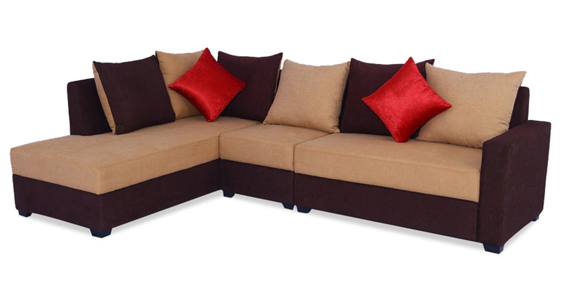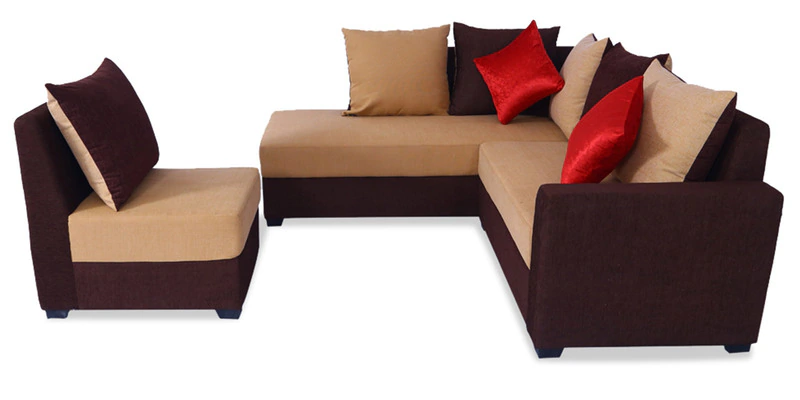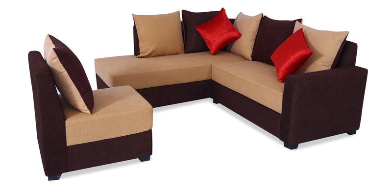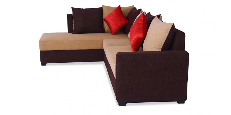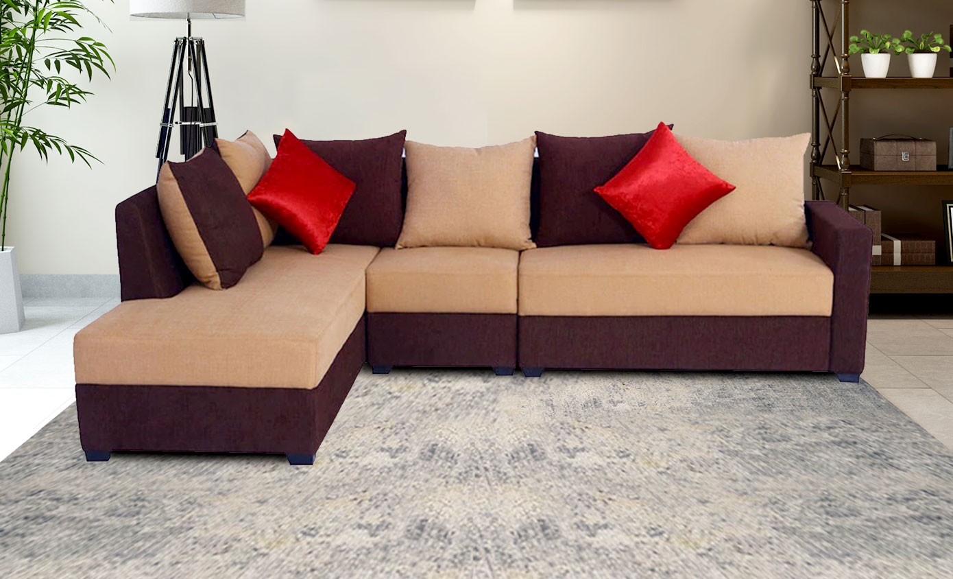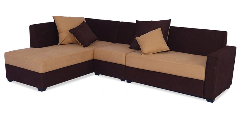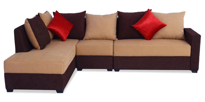 Morena RHS Sectional Sofa With Pouffe In Beige and Brown Colour by jfwoods. Comfortable and elegant seating solution for your everyday needs. Fabric upholstered cushion seating. It makes a perfect corner piece in the bedroom and living room. It is ergonomically designed to offer relaxation and comfort to the body.