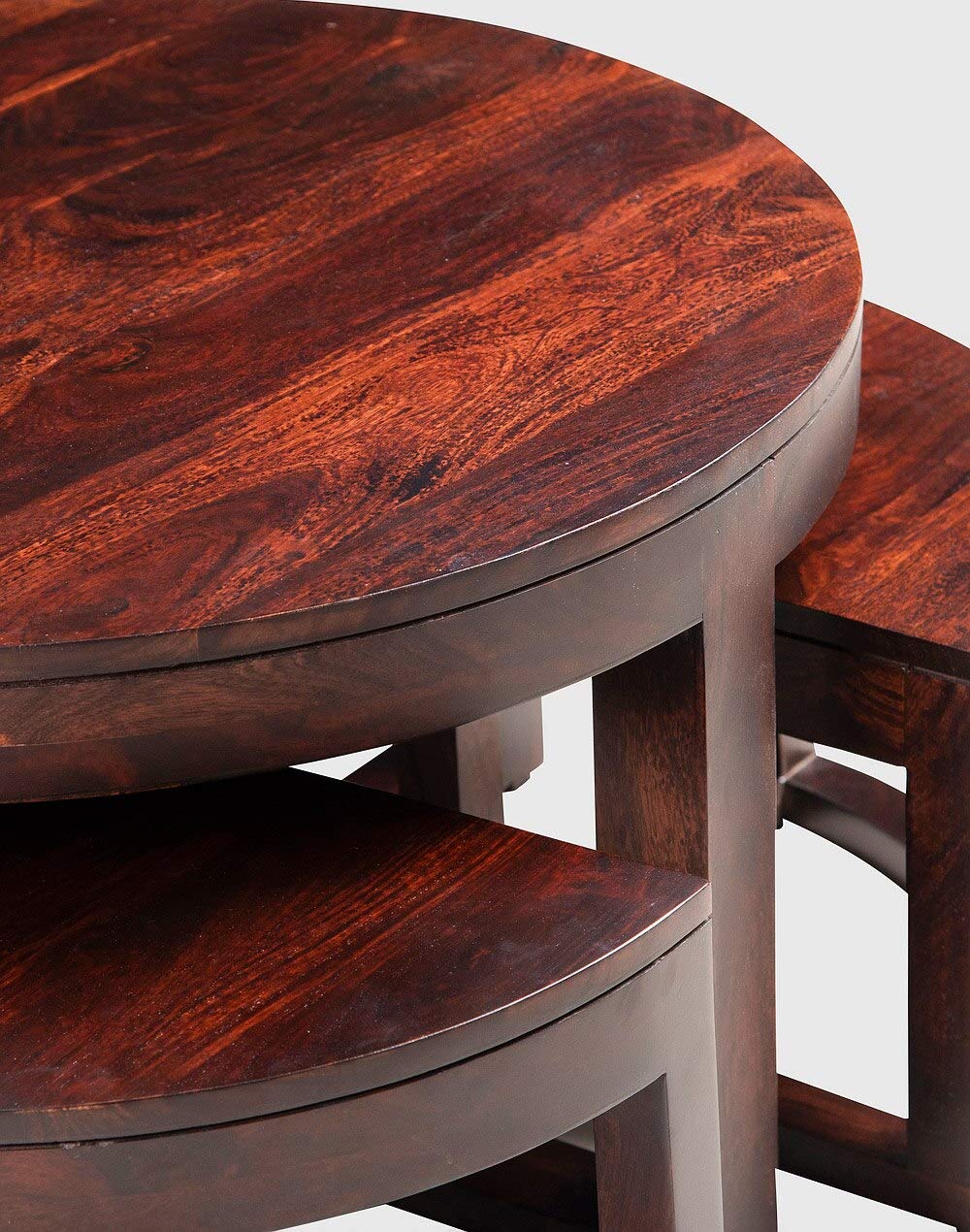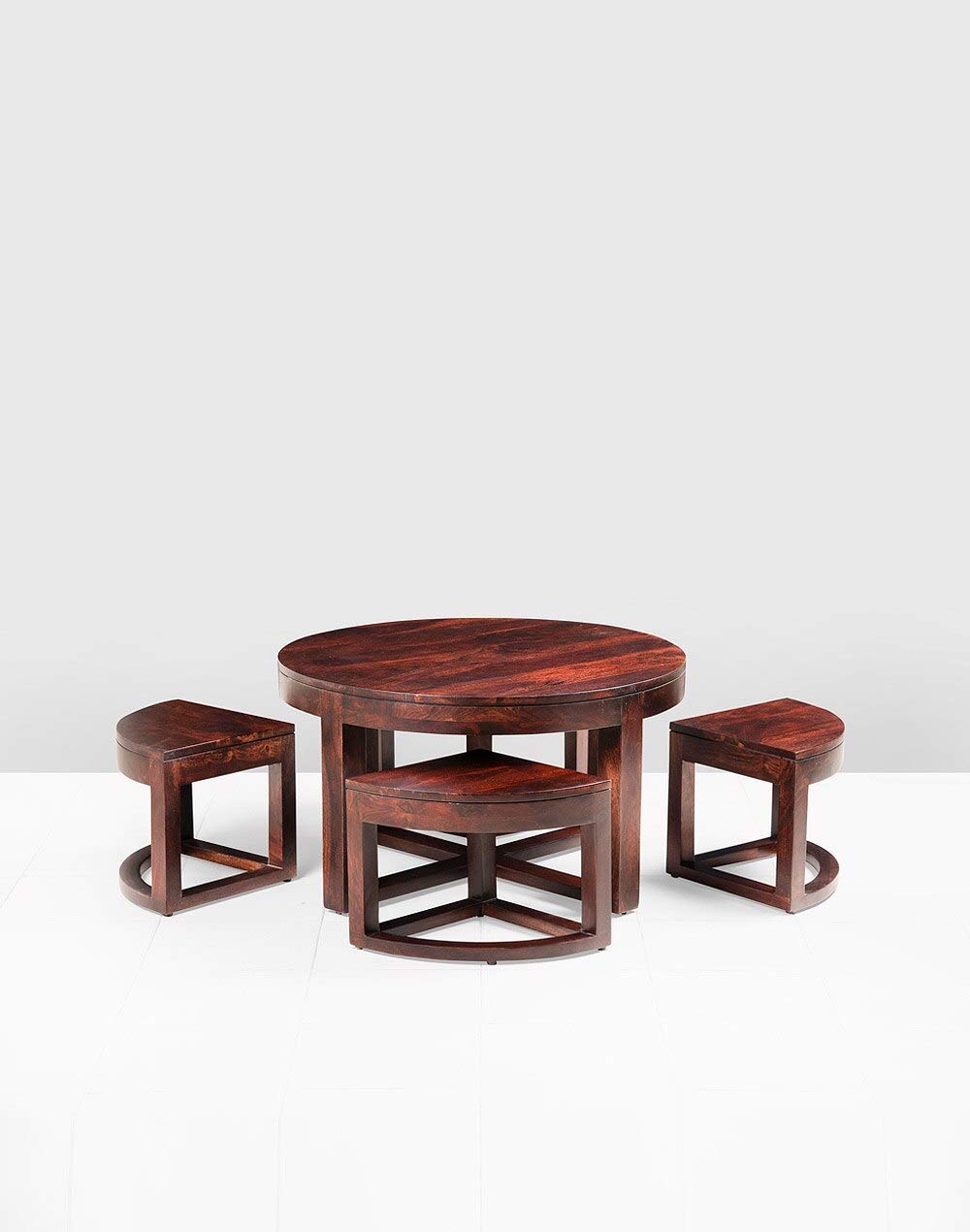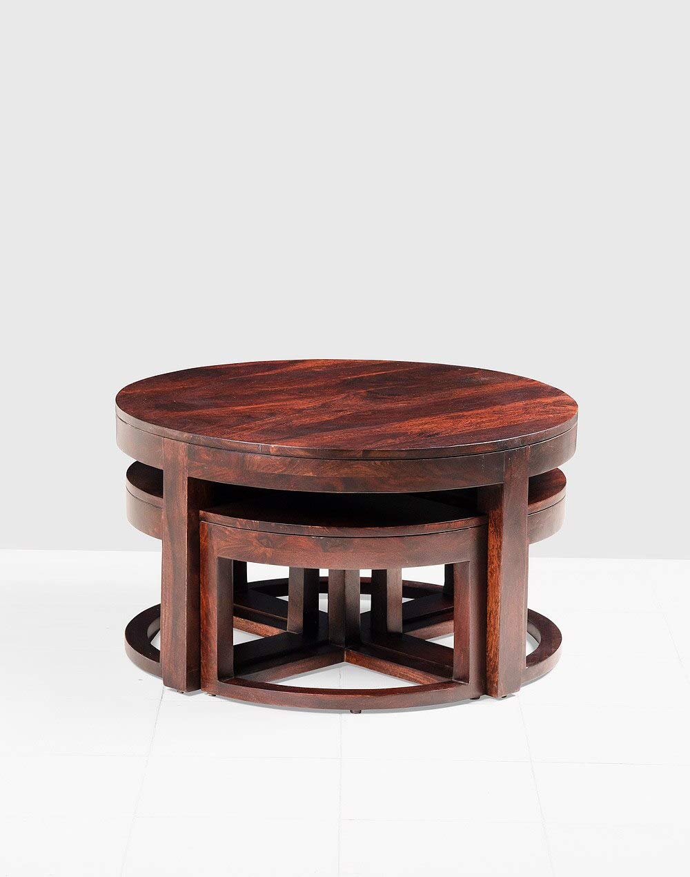 Noah Round Coffee Table with 4 Stools by Jfwoods.Coffee table is manufactured in solid sheesham wood with a natural finish. The table blends perfectly in any home décor as a  coffee table  with your loved ones  a cup of coffee. The coffee table is easy to handle. The interesting pattern makes the coffee table a unique classic of all times.