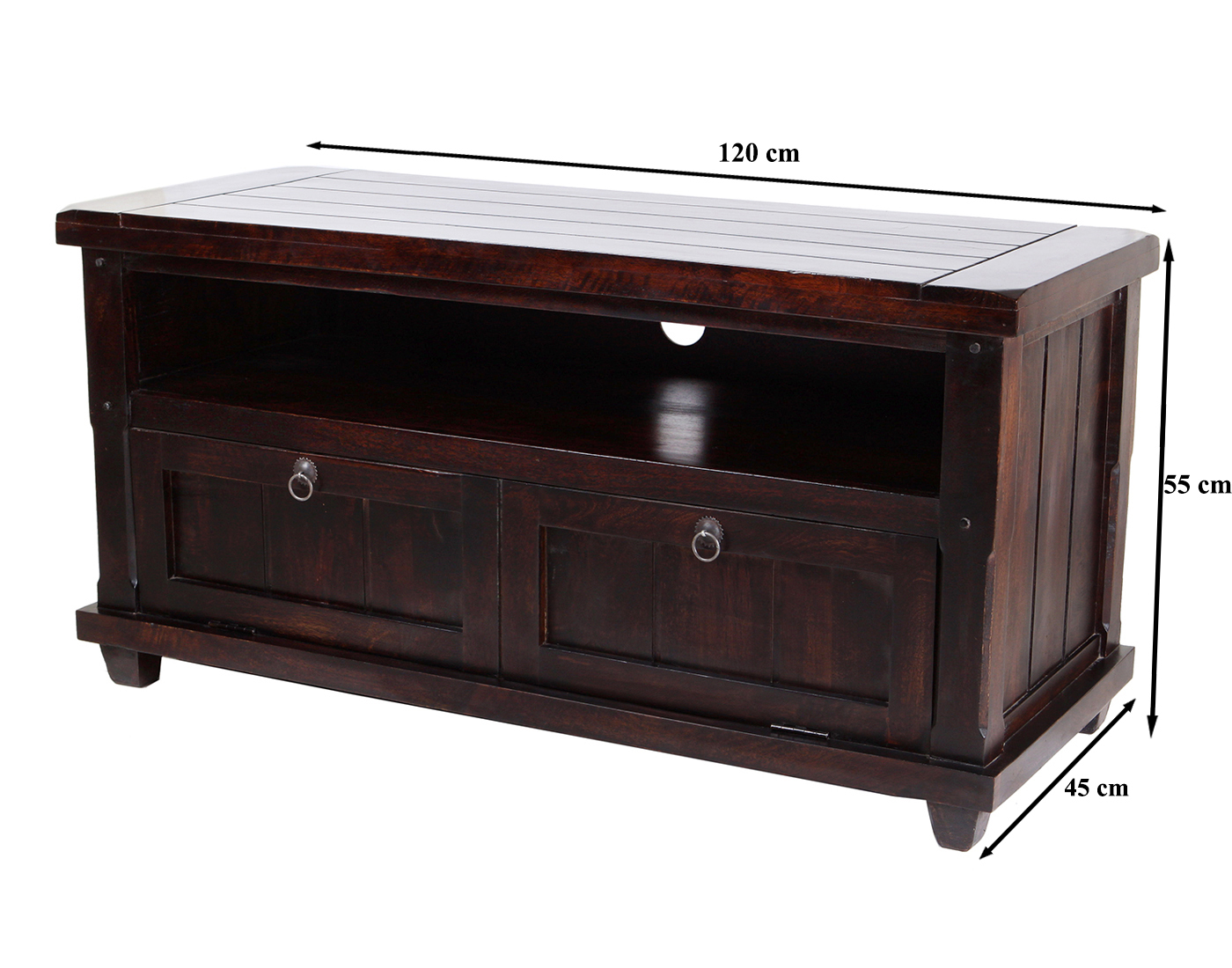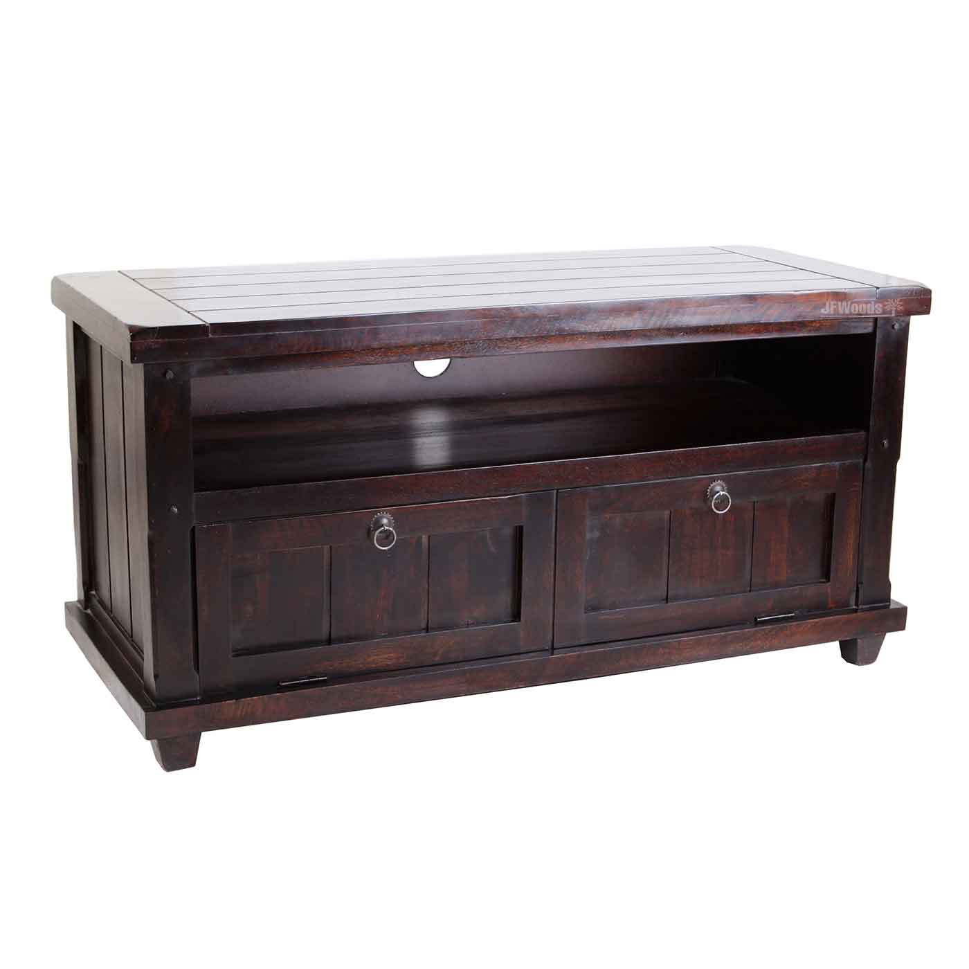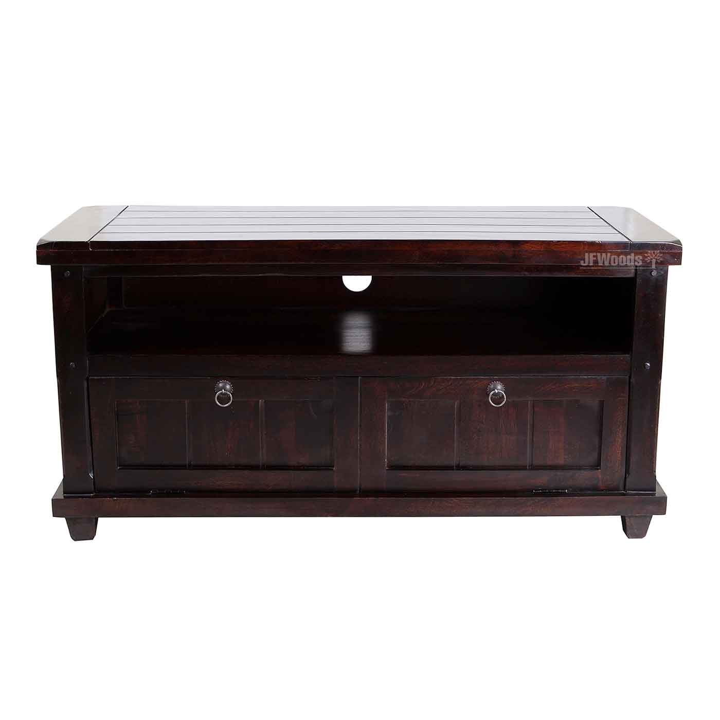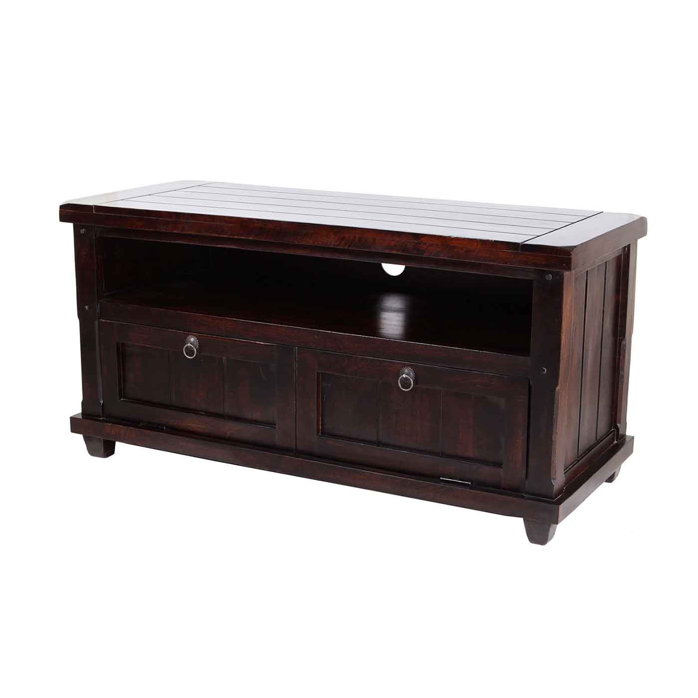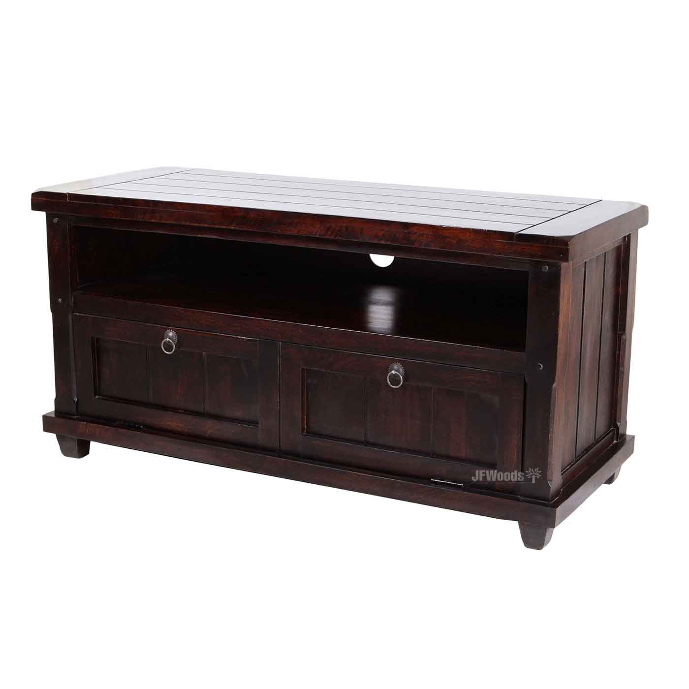 TV cabinet with 2 drawers & 1 open shelf made in solid mango wood .TV shelf is a combination of an stand with a display shelf. components and other decorative items openly in these living room & Drawing room essentials. It can be handled easily in your living room & Drawing room space.