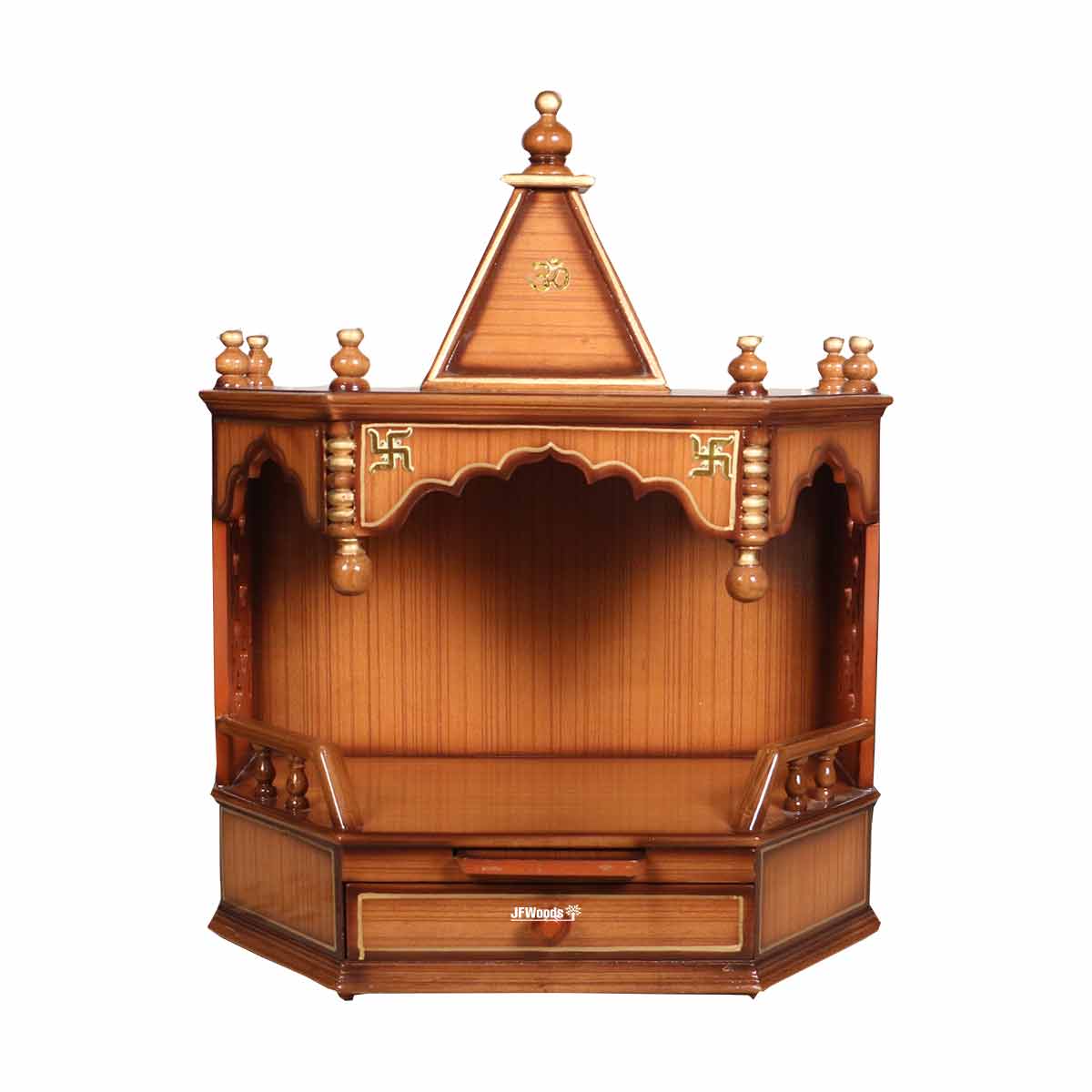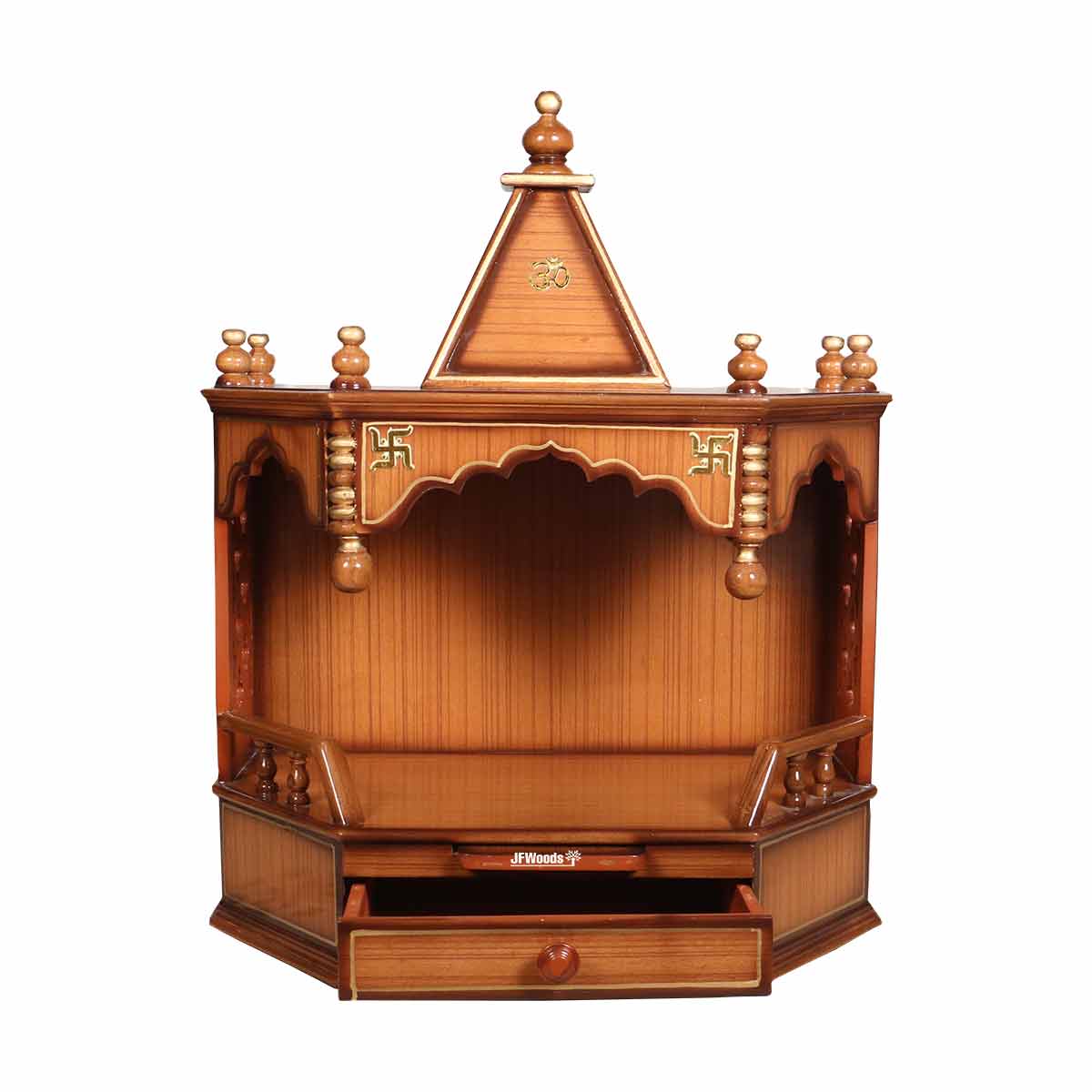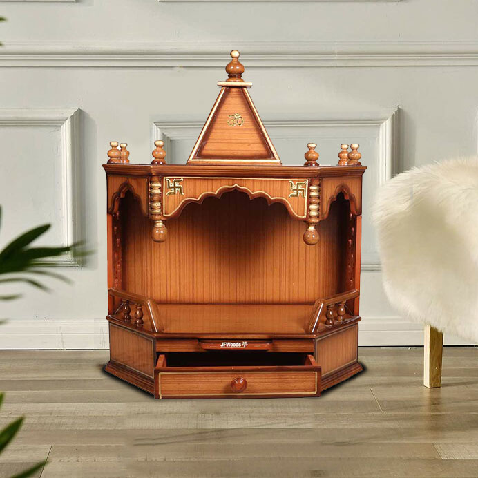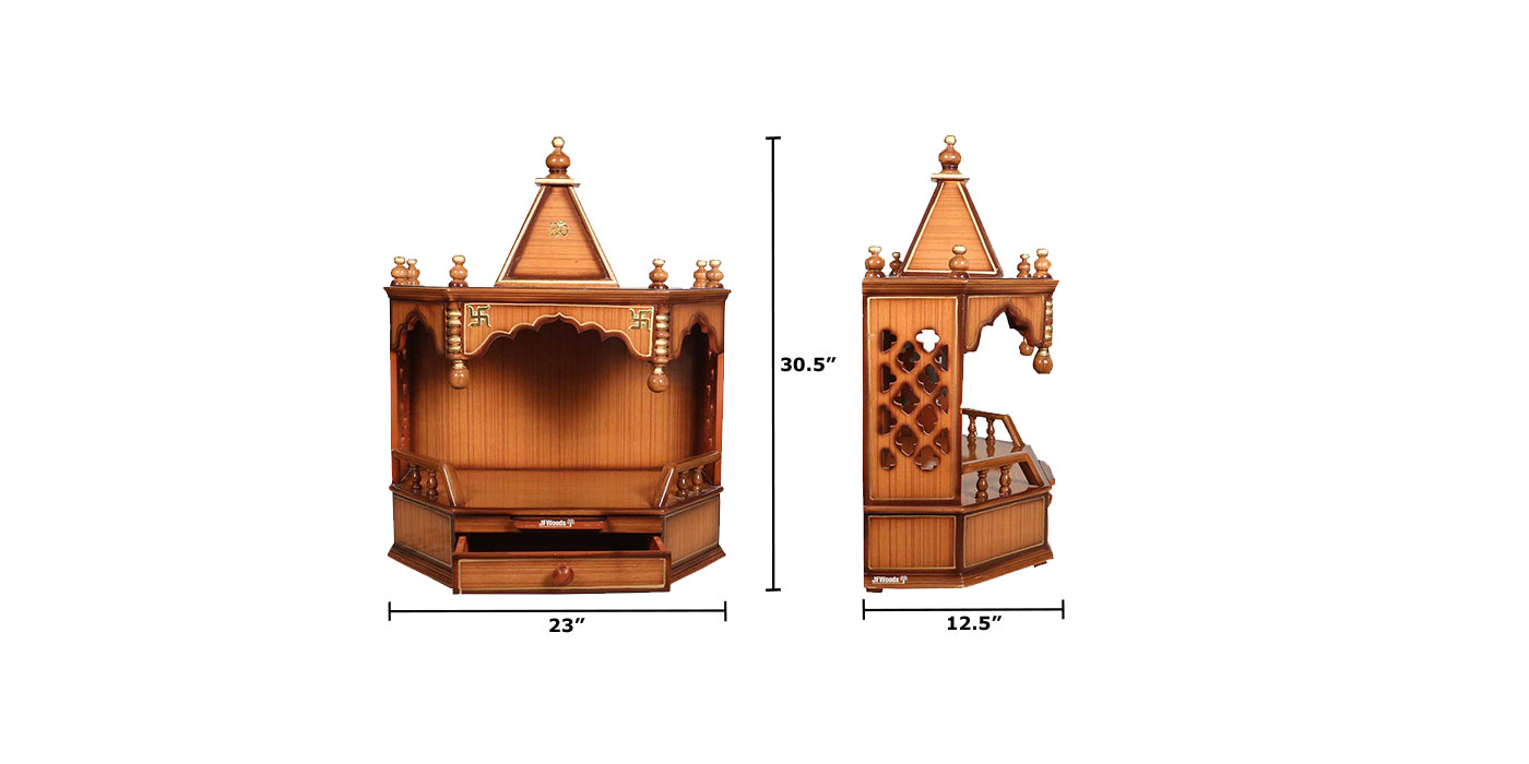 Verona Teak Wood One Drawer Mandir by jfwoods. The temple is designed and built-in teak wood and teak veneer with polish finish. The wooden temple has one drawers to store your pooja accessaries. So hereby we present home temple to bring peace and prosperity to your life for your well-being. Bring home the spirtuality with this divine fully handmade home temple. Its for the people where they can forget there differences unite to serve god and society. The wooden temple is extremely durable. It can wall mounted as well.