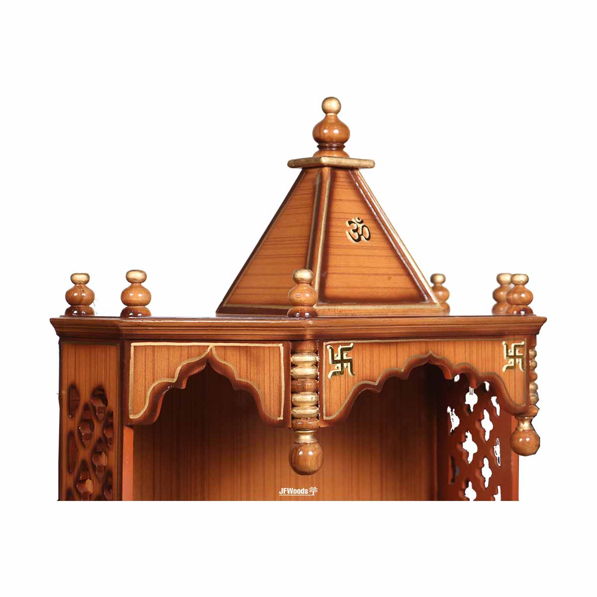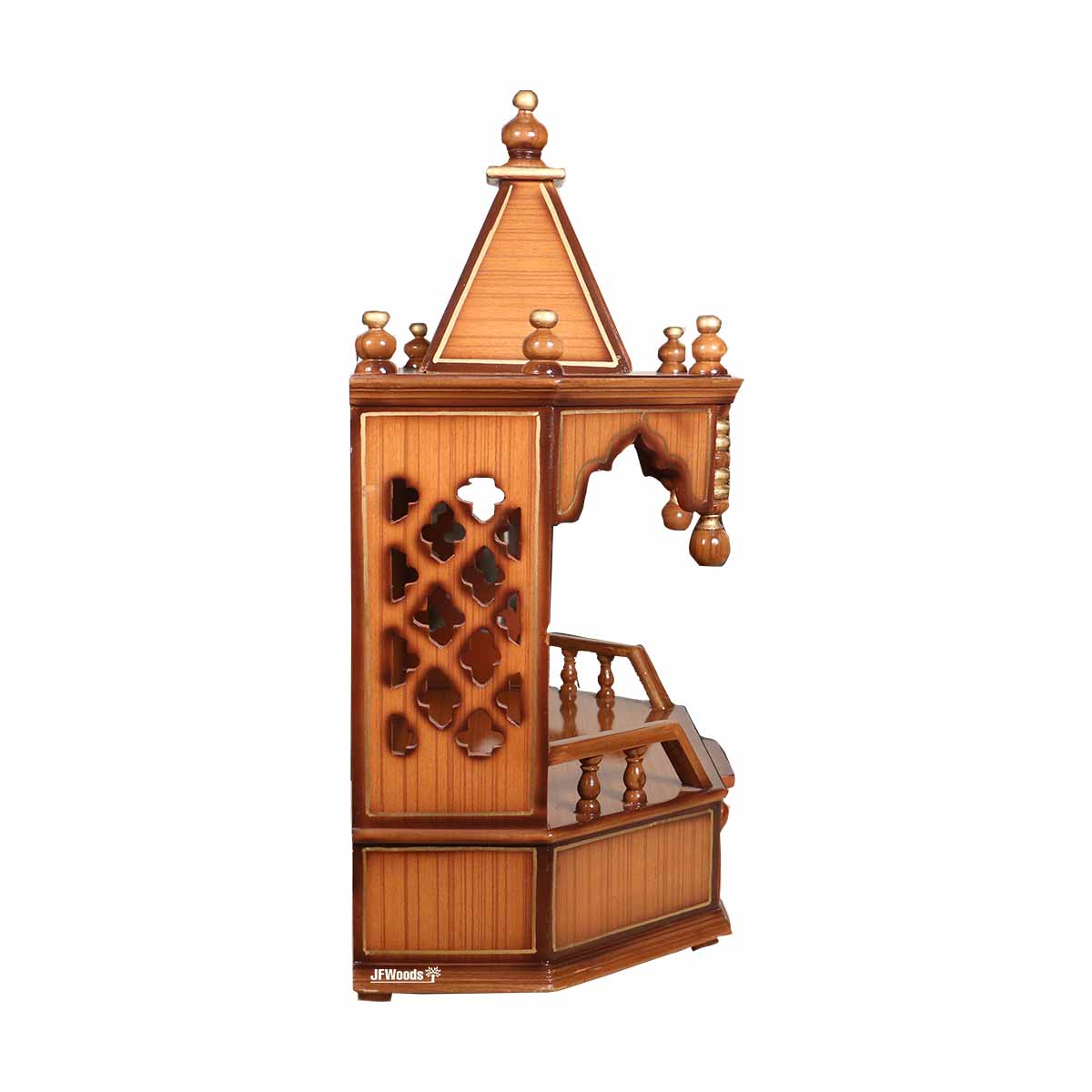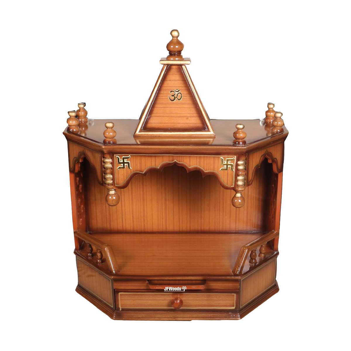 Verona Teak Wood One Drawer Mandir by jfwoods. The temple is designed and built-in teak wood and teak veneer with polish finish. The wooden temple has one drawers to store your pooja accessaries. So hereby we present home temple to bring peace and prosperity to your life for your well-being. Bring home the spirtuality with this divine fully handmade home temple. Its for the people where they can forget there differences unite to serve god and society. The wooden temple is extremely durable. It can wall mounted as well.